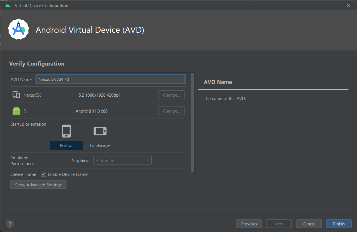 - AVD Name: a name for your device, which appears in the Android Virtual Device (AVD) manager whenever you need to start it.